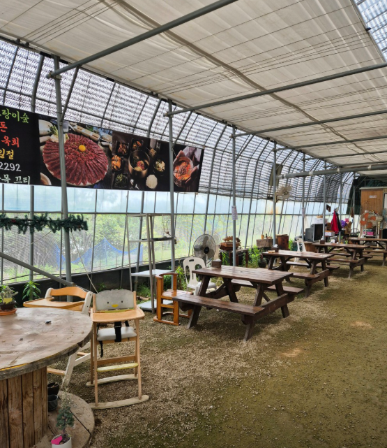 둔치국수는 비닐하우스를 개조한 시골 정자 분위기로, 실내에는 당구대, 자전거, 음향 장비 등이 있어 소소한 볼거리와 재미를 더합니다.