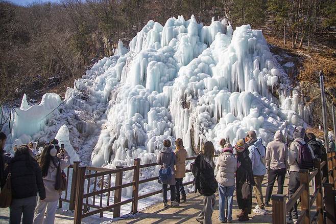 행사장에서 조금 더 올라가면 어비계곡의 대표 풍경인 빙벽이 눈앞에 등장합니다. 계곡 벽면에 물을 뿌려 만든 인공 빙벽은 압도적인 규모를 자랑하며, 겨울에만 볼 수 있는 비현실적인 장면을 선사합니다. 경기도 겨울 여행지 추천 리스트에서 빠질 수 없는 곳입니다.