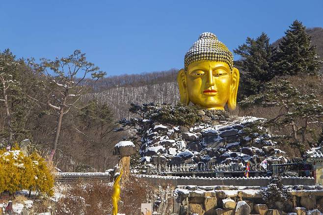 사방을 산으로 둘러싸고 있으면서도 접근이 쉬운 와우정사는, 눈이 내린 날 더욱 빛이 나는 이국적 사찰입니다. 입구에서 가장 먼저 눈길을 사로잡는 것은 높이 8m에 달하는 황금빛 불두. 전통 사찰에서는 보기 힘든 독특한 분위기라 방문객들은 자연스레 발걸음을 멈추게 됩니다.
