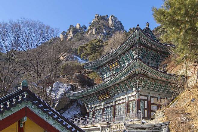 전각 대부분이 계단 사이사이에 배치되어 있어 조금만 올라가도 하얀 눈을 머금은 기와지붕들이 층층이 펼쳐지는 장면을 만날 수 있습니다. 특히 범종각에서 내려다보는 영산전의 설경은 많은 이들이 ‘겨울의 망월사를 찾는 이유’로 꼽는 절경입니다. 도심에서 가깝지만 풍경은 도심과 멀리 떨어진 듯한 고요함을 띠죠.