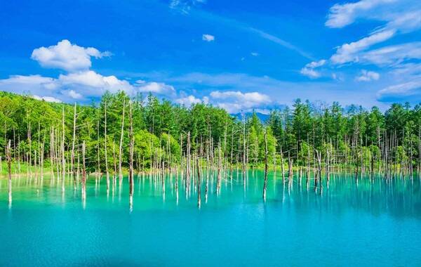 다음으로 소개해드릴 여름철 홋카이도 여행 가볼만한곳은 청의 호수입니다. 이곳은 도카치산에서 흘러내리는 진흙을 막기 위해 조성된 인공호수로 매우 아름다운 색의 물과 호수에 솟아있는 나무들로 인해 더욱 신비로운 분위기를 만드는 곳입니다.