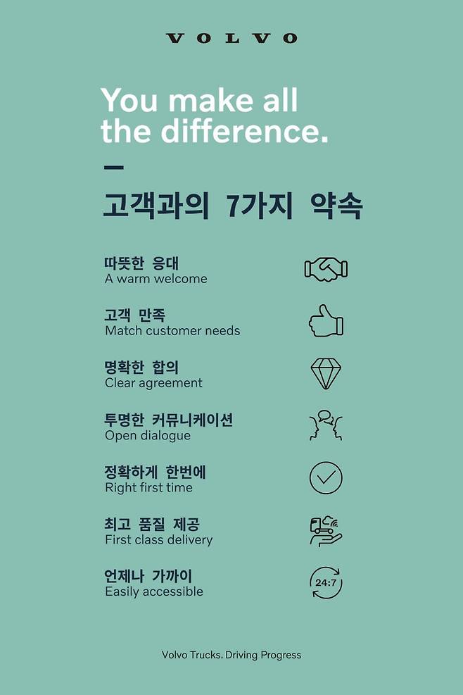 먼저, 볼보트럭의 서비스 교육 활동은 볼보트럭이 지향하는 ‘고객과의 7가지 약속(7 Customer Commitments)’—▲따뜻한 응대 ▲고객만족 ▲명확한 합의 ▲투명한 커뮤니케이션 ▲정확하게 한 번에 ▲최고의 품질 제공 ▲언제나 가까이- 를 담은 서비스 철학을 반영하여 실행된다.