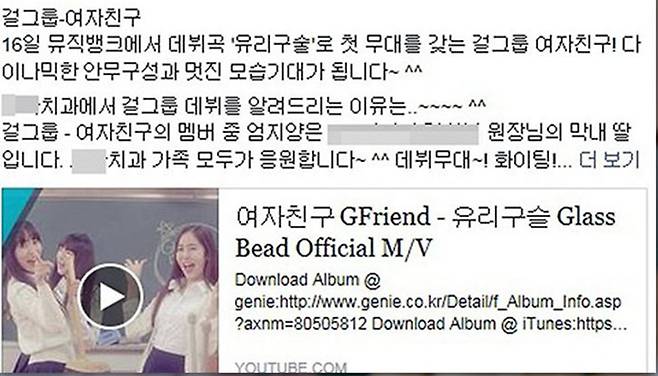 "걸그룹 데뷔를 알려드리는 이유는 멤버 중 엄지 양이 원장님의 막내딸입니다"라고 덧붙였죠.