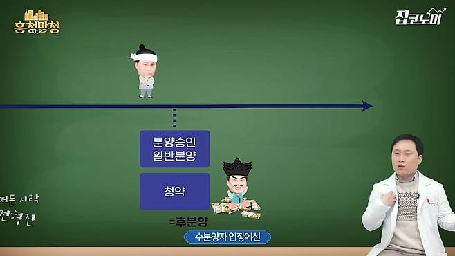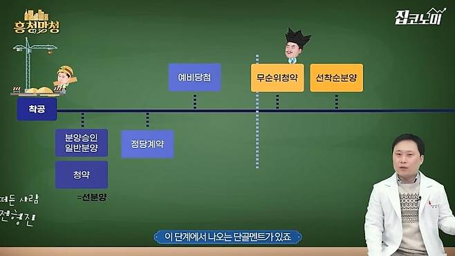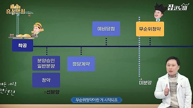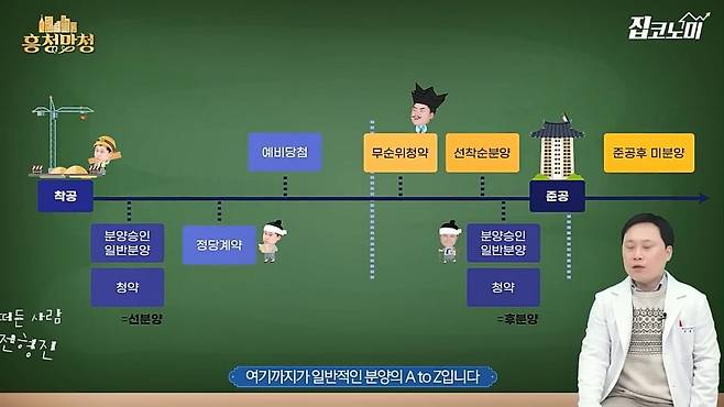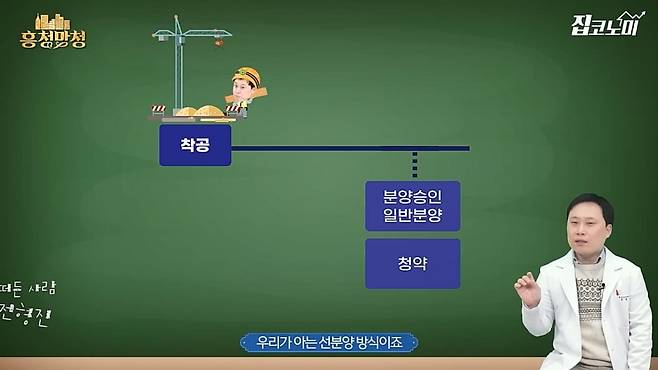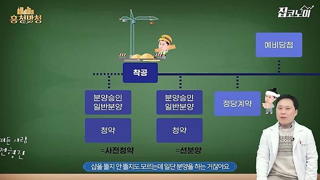 여기까지가 일반적인 분양의 A to Z입니다. 그런데 요즘엔 앞에 뭐가 하나 더 생겼죠. 사전청약을 구조도에 뿌려보면 위치가 이렇게 됩니다. 삽을 뜰지 안 뜰지도 모르는데 일단 분양을 하는 것이죠. 사전당첨자 입장에선 언제가 될지 모르는 준공 시점까지 무주택 자격을 유지해야 하는 리스크가 있습니다.