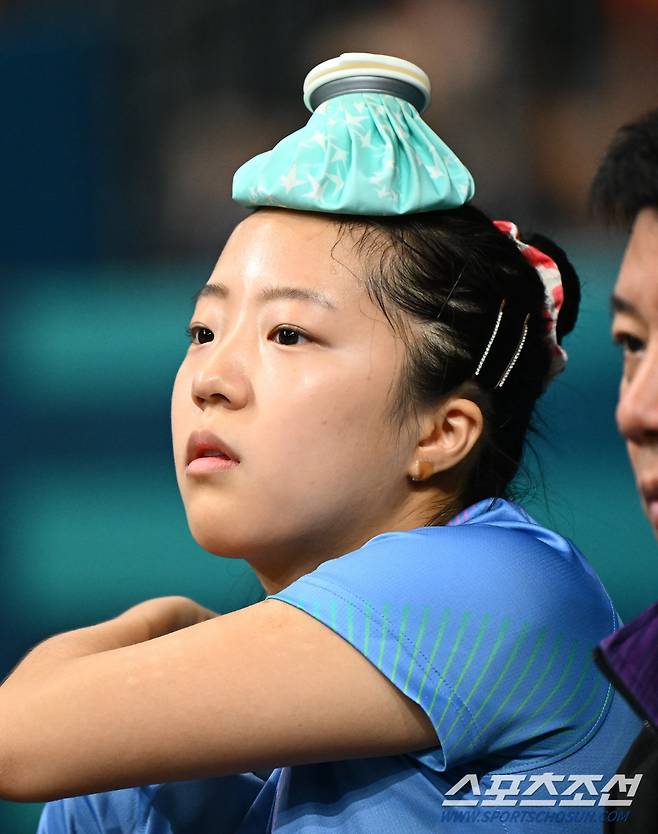 신유빈이 1일 오후 프랑스 사우스 파리 아레나에서 열린 파리올림픽 탁구 여자 단식 8강에서 '일본 에이스' 히라노 미우(세계 13위)에 풀게임 접전 끝에 게임스코어 4대3으로 승리했다. 얼음주머니로 이마에 열을 식히는 신유빈. 파리(프랑스)=정재근 기자 cjg@sportschosun.com/2024.8.1/