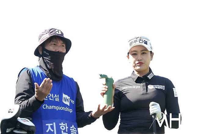 [mhn포토] 지한솔, 캐디 이재천과 살피는 공략 지점