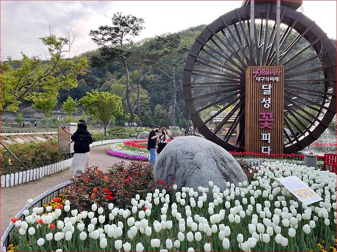사진 포인트: 입구 튤립 밭은 인증샷 명소라 매우 붐빕니다. 조금 더 안쪽으로 들어가 옥연지 호수가 배경으로 걸리도록 카메라를 들이대면 훨씬 한적하고 탁 트인 인생샷을 남길 수 있습니다.
