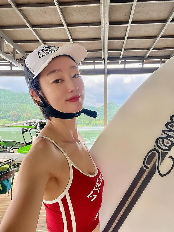 빨간색 탱크톱과 쇼츠를 세트로 맞춰 입고, 서핑보드를 품에 안은 채 담은 이 시리즈는 단순한 바캉스 스냅 그 이상이에요.