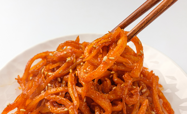 진미채(오징어채 무침)는 달콤하고 고소해서 아이부터 어른까지 모두 좋아하는 밑반찬입니다. 하지만 설탕, 물엿, 고추장, 마요네즈 등 고당·고염 조미료가 듬뿍 들어가고, 보존제나 착색료까지 첨가된 경우가 많아 자주 먹으면 간과 신장에 부담을 줄 수 있습니다. 진미채 대신 신선한 오징어를 데쳐 초장에 찍어 먹거나, 오징어채 대신 두부나 버섯볶음으로 단백질을 보충해보세요.