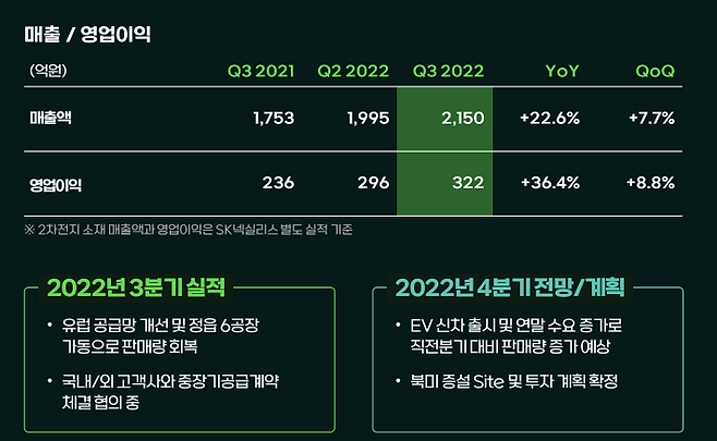 3분기 동박 사업은 SKC의 사업부문 중 화학부문(영업이익률 2.9%)과 반도체재료부문(3.8%) 대비 수익성이 가장 높았다. 앞으로 SK넥실리스는 시장을 더욱 확대할 계획이다. 유럽의 공급망을 개선했고, 국내외 고객사와 동박 납품을 준비하고 있다. IRA에 대비해 북미 시장 진출을 준비하고 있다.