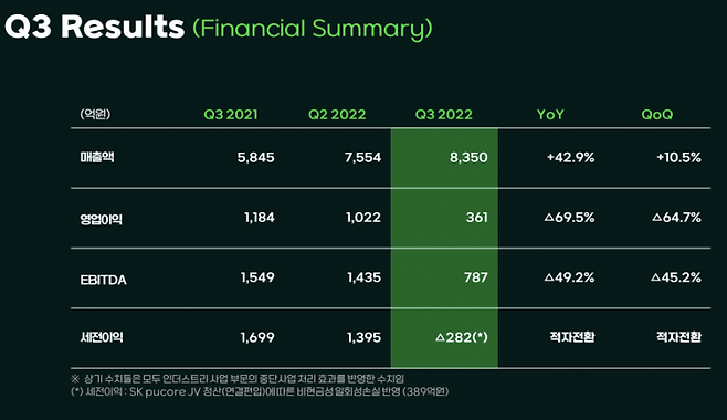 SKC는 10일 3분기 경영실적을 발표했다. 3분기 매출은 8350억원, 영업이익은 361억원을 기록했다. 감가상각전영업이익(EBITDA)은 787억원으로 집계됐다.