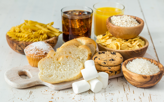 특히 흰쌀밥, 떡, 국수, 빵처럼 정제된 탄수화물은 혈당을 급격히 올리면서 지방 축적을 촉진해 인슐린 기능을 무너뜨립니다. 결국 이는 당뇨병은 물론 복부 비만, 지방간으로 이어질 수 있습니다.