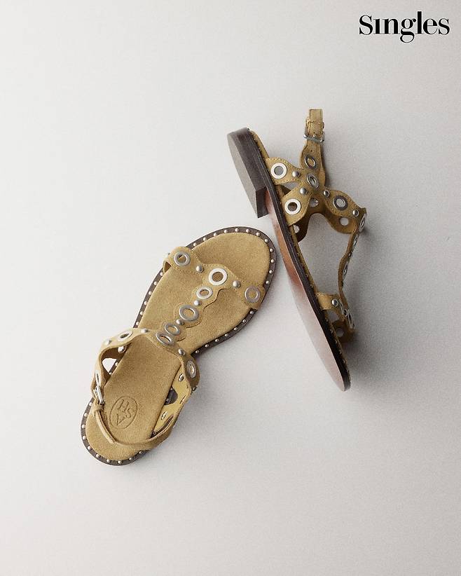 펀칭 디테일의 T 스트랩 샌들은 43만7000원 Ash.