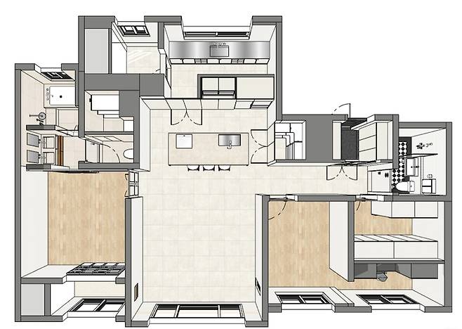 1. 저희 부부는 공간마다 용도가 확실하게 분리되는 것에 편안함을 느끼고, 각자의 공간을 가지는 것이 중요한 사람들이더라고요. 그렇게 하나의 주방을 두 공간으로 나누고, 하나의 욕실을 세 공간으로 나누고, 하나의 방을 두 공간으로 나누는 레이아웃을 계획했어요.