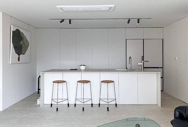 또한 음식과 술을 좋아하지만 나가는 건 귀찮은 집순이 집돌이 부부에겐 집이 최고의 놀이터이기 때문에 거실 역시 주방과 마찬가지로 보통의 집보다는 살짝 상업 공간에 가까운 느낌이 나길 원했어요.
