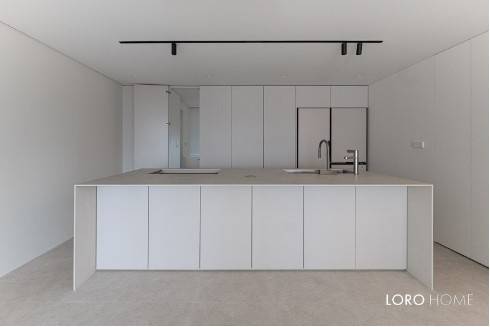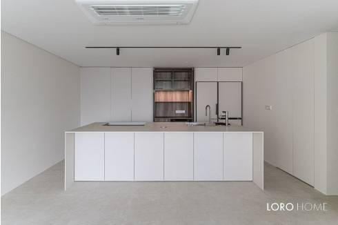 주방 상판에 대한 고민만 몇 달은 했고, 여러 소재를 다 직접 눈으로 보고 판단하기 위해 여기저기 발품을 다녔어요. 결국 최종적으로 세라믹 공장까지 달려가서 직접 고른 이태리 세라믹 상판을 깔아줬고, 엘리베이터에 들어가지 않는 사이즈라 둘로 나눠야 한다는데 하나로 이어진 모습을 포기할 수 없어서 크레인까지 불러 고이고이 모셔왔답니다.