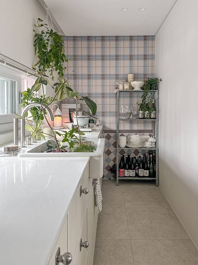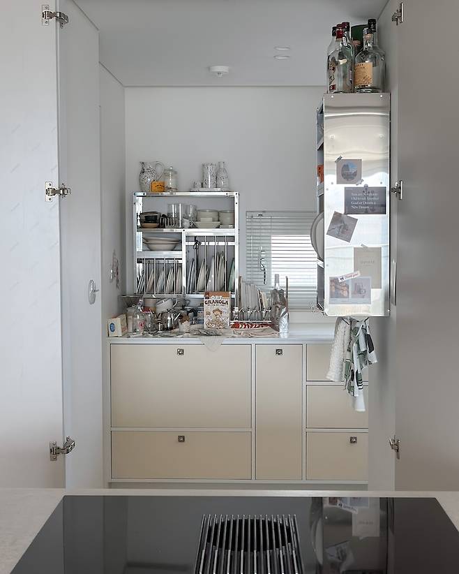 메인 주방은 정말 딱 요리를 하고 음식과 술을 즐기는 공간으로만 사용하고, 그 외에 집안일은 이 공간에서 하고자 했으며 정확히는 팬트리 역할을 하는 수납공간이 필요했어요.