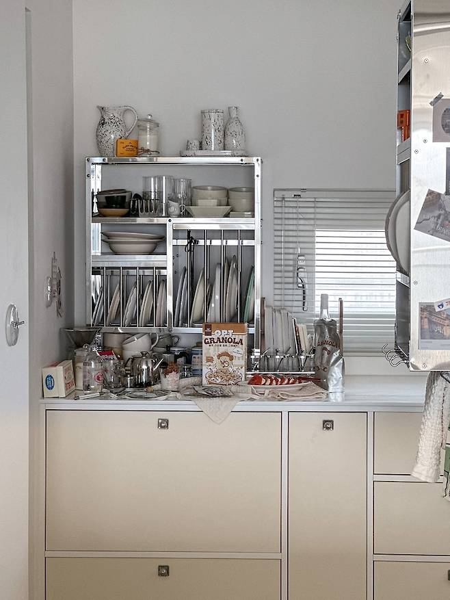 여기선 정말 많은 일을 해요. 바로 옆 세탁실에서 빨래를 꺼내와 개고, 택배를 정리하기도 하고, 걸레도 빨고, 가끔 베이킹도 하고, 화분에 물도 주고, 꽃꽂이도 하고, 자주 사용하지 않는 그릇들을 수납해두고, 뽀숑이가 목욕 후 드라이까지 하는, 정말 말 그대로 다용도실입니다.