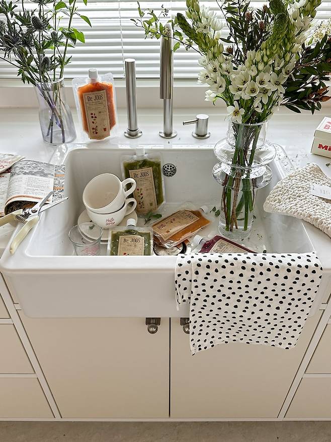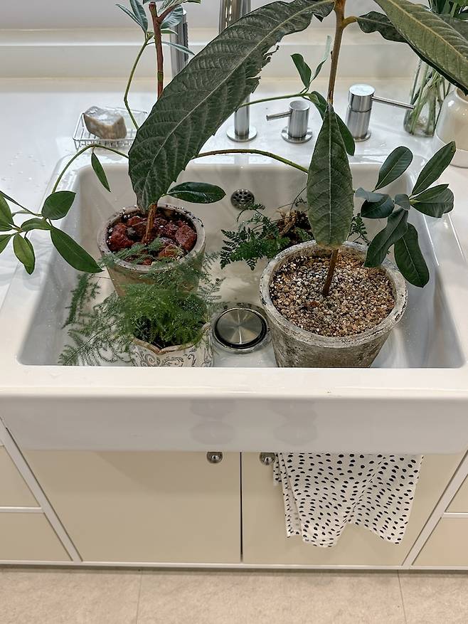 그래도 이쁨에 대한 만족도는 10000%! 다행히 저는 요리용 싱크볼이 아닌, 꽃꽂이, 화분 물 주기, 뽀숑이 목욕 등으로 사용하는 공간이라 크게 불편하진 않아요 :)