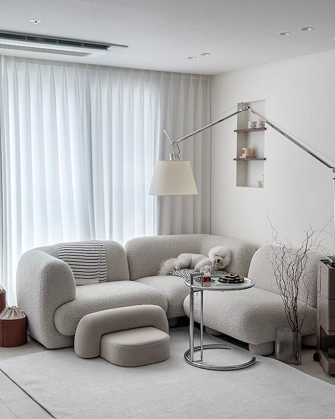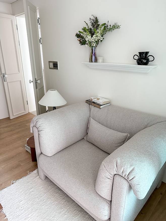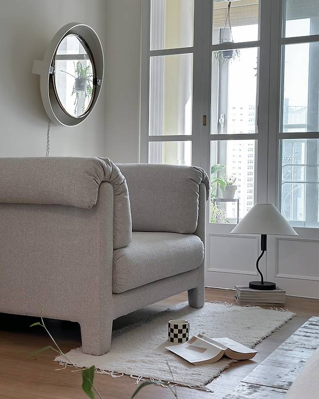 아이보리와 그레이 사이의 묘한 웜톤 컬러에 부클레 소재가 루바 도어나 프렌치 도어 같은 요소들과도 잘 어울리는 것 같아 만족스럽게 사용하고 있습니다.