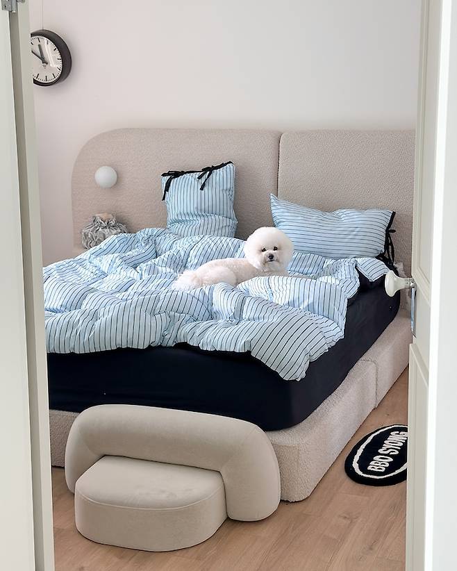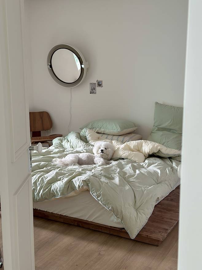 처음 이사 올 때까지만 해도 뽀숑이가 어떠한 교육에도 계단을 사용하지 않고 휙휙 날아다니는 에너자이저였어서 그의 슬개골을 위해 침대는 15cm 저상형 원목 프레임으로 선택했어요.