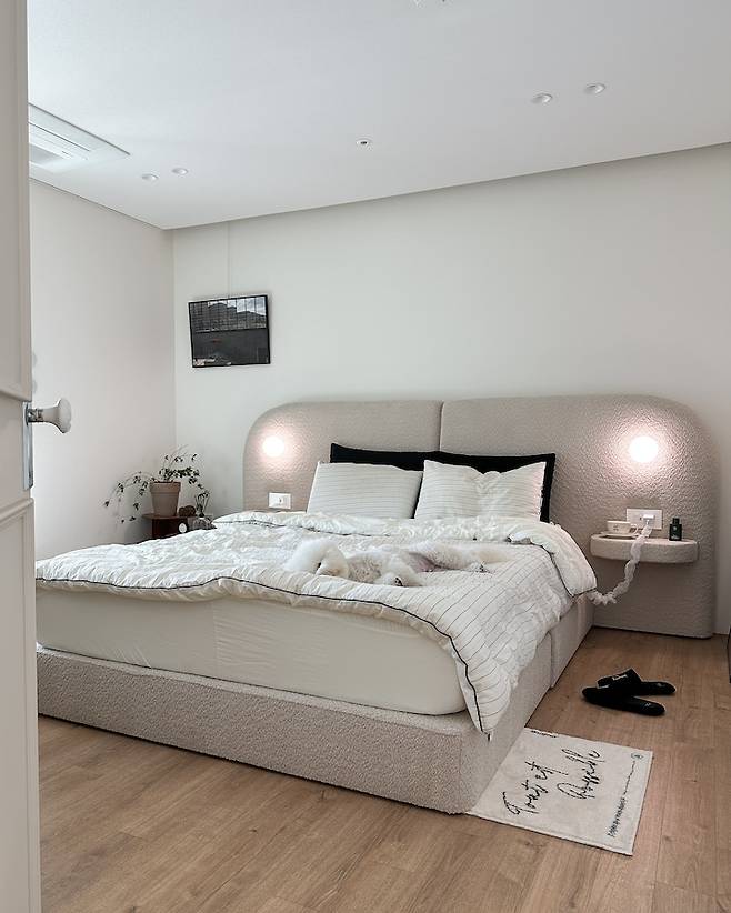 사실 뽀숑이 집사들은 높은 침대를 원하지만 뽀숑이를 위해 어쩔 수 없는 선택이었고, 그래도 낮고 가벼워서 배치가 자유롭다는 장점이 있더라고요. 이 땐 안방 문이 있는 벽 쪽으로 배치했을 때네요. 우측으로 보이는 갤러리 도어 뒤편에는 작은 베란다가 있으니 뒤에서 다시 보여드릴게요 :)