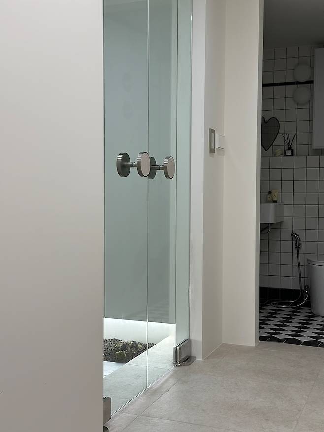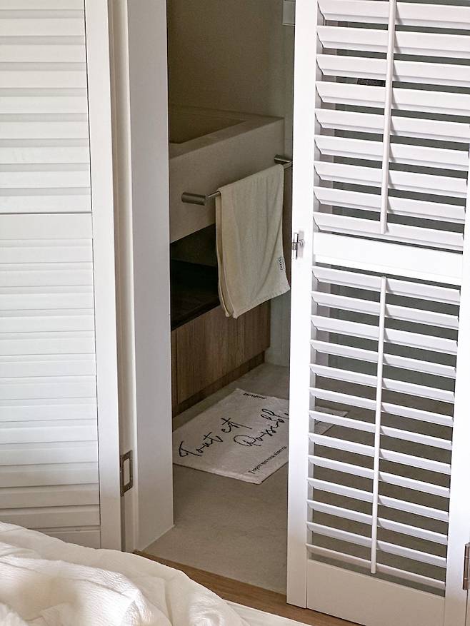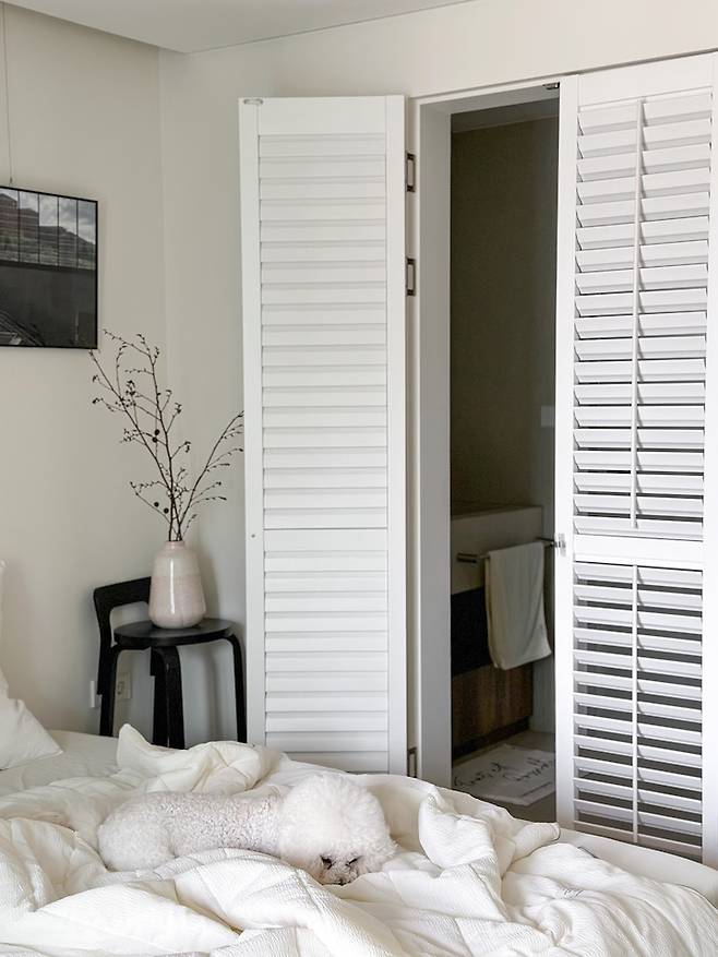욕실 앞 루바 도어 설치는 예쁨도 예쁨이지만 실용적으로도 정말 좋아요! 아무래도 욕실은 사용 후 습할 수 있는 공간이라 환기가 필요하지만 왠지 문은 닫아두고 싶은 마음이 늘 부딪혔었는데, 환기가 필요할 땐 문은 닫은 채 루바를 열어 공기가 통하게 해주고 있고요.