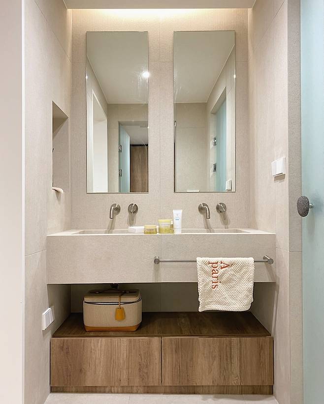 루바 도어를 열고 들어오면 건식 세면대 공간으로 안방 욕실이 시작됩니다. 이 공간은 기존 아파트에서는 파우더룸으로 이용되는 공간인데, 저는 화장을 매일 하는 타입이 아니라 넓은 파우더룸이 필요하지 않아서 세면대를 여기에 배치하고 건식으로 사용하고 있어요.