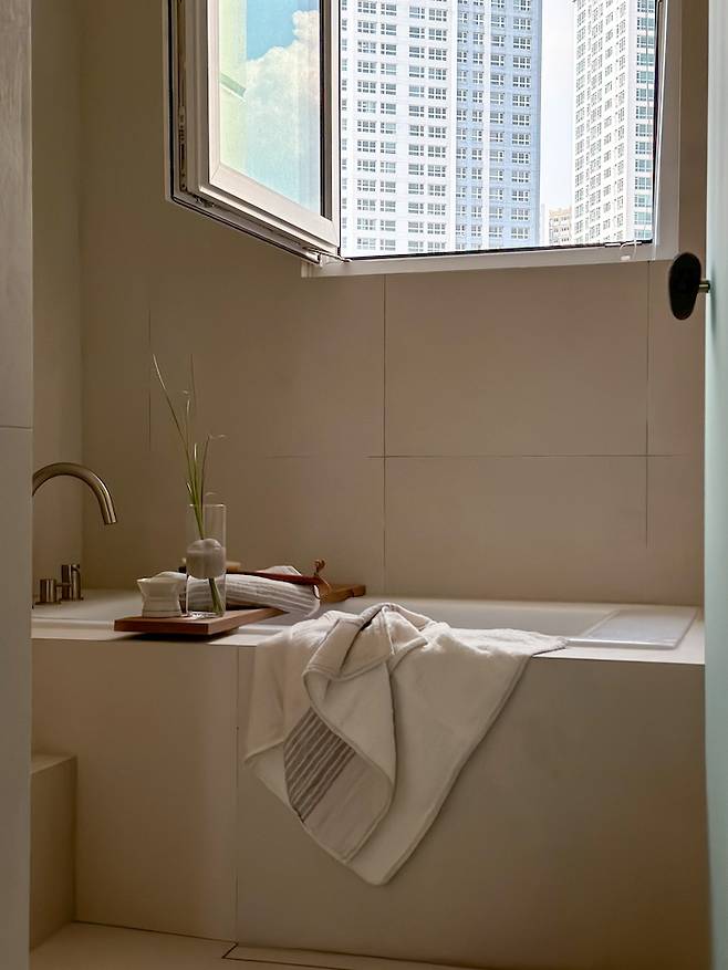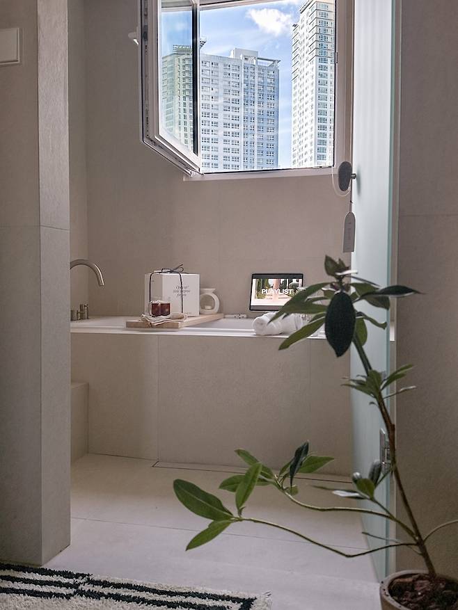 욕조의 형태에 대해서도 많이 고민했어요. 동그란 이동식 욕조가 가장 하고 싶었지만 좁은 저희 욕실에 배치하게 되면 벽에 너무 딱 붙어서 청소 관리가 힘들겠더라고요. 무엇이든 저희 라이프 스타일에 맞추는 게 가장 중요하기에 저희가 좋아하는 반신욕에 대해서 먼저 생각해 봤어요.