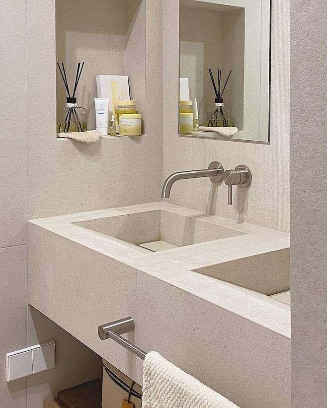 마찬가지로 세면대 옆에도 이렇게 매립 선반을 제작해서 간단한 기초 케어 제품은 모두 여기에 두고 씻자마자 바로 사용할 수 있게 했어요. 타일 세면대로 제작하니 세면대 주변이 평평해서 화장품을 내려두고 사용하기 편해서, 세면대가 곧 화장대 역할을 하게 되더라고요.