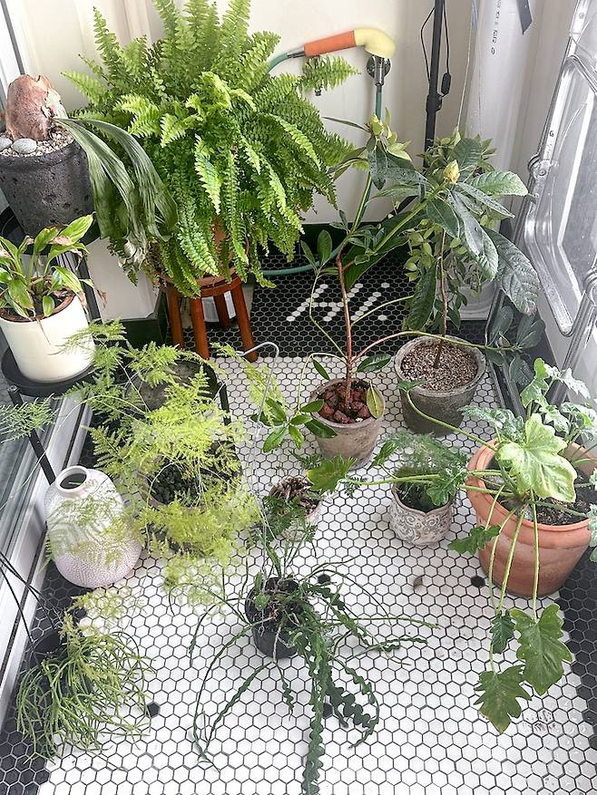 그리고 베란다에는 작은 모자이크 타일을 시공했어요. Hi! 레터링을 포인트로 심어 볼 때마다 기분 좋아지는 공간이에요. 아직도 초보 식집사지만 그래도 꽤 많은 식물들을 키우고 있어서 작은 화분들은 다용도실에, 큰 화분들은 이 공간에 한 번씩 모아두고 시원하게 물 샤워 시키면서 일광욕+통풍을 해주고 있어요.