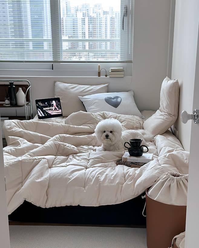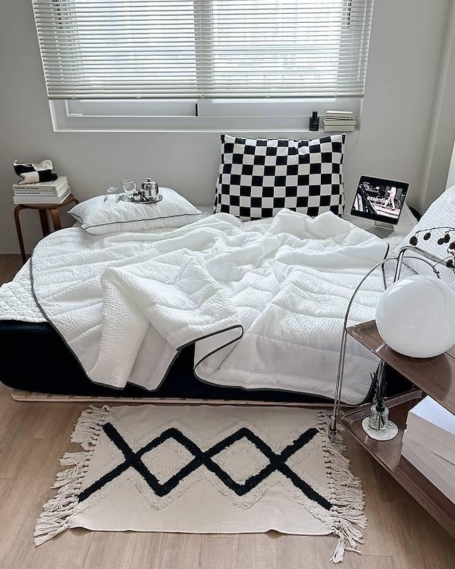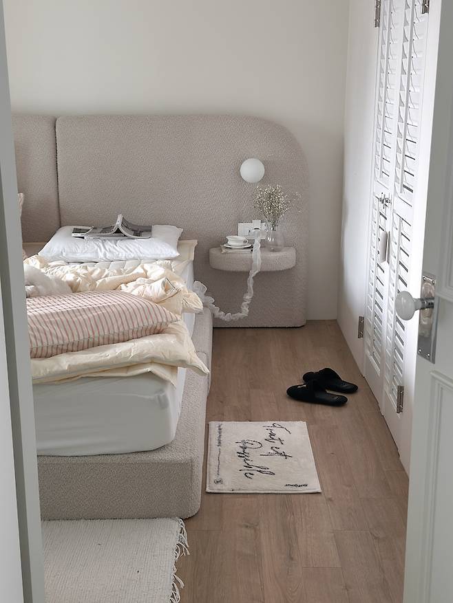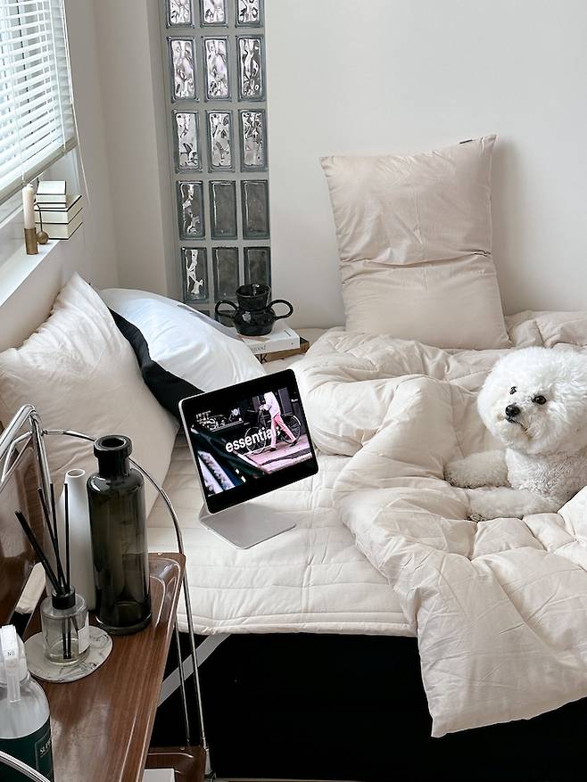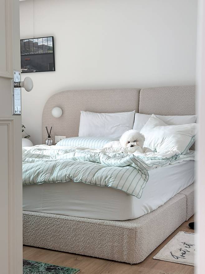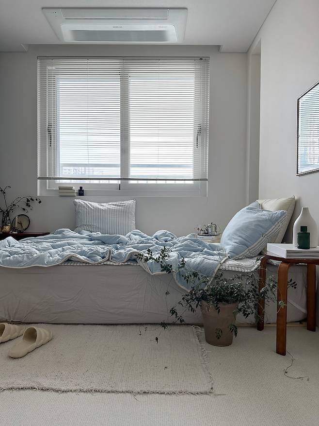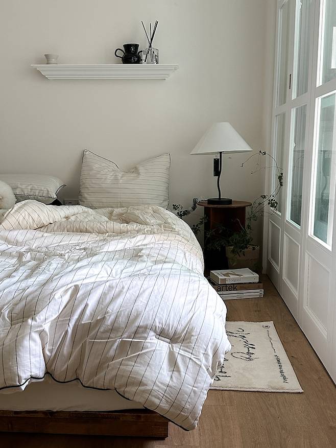 대신 침대가 무거워져서 배치는 자주 변경할 수 없으니 침구 스타일링으로 변화를 주고 있어요. 침구 먼지에 예민하기도 하고, 패브릭만 바꿔도 공간의 느낌이 완전히 달라지는 쾌감? 이 좋아서 가구 배치 변경만큼 끊을 수 없는 저의 취미랍니다.