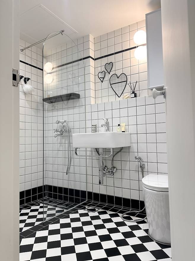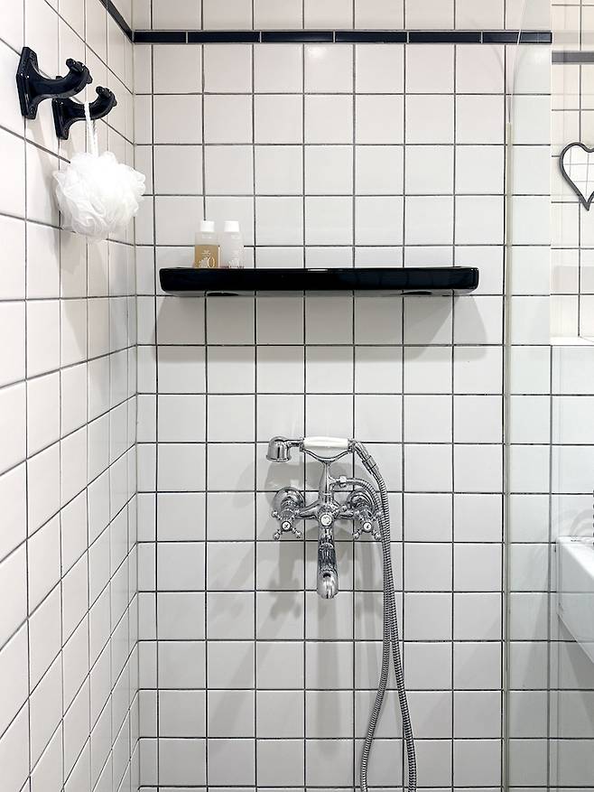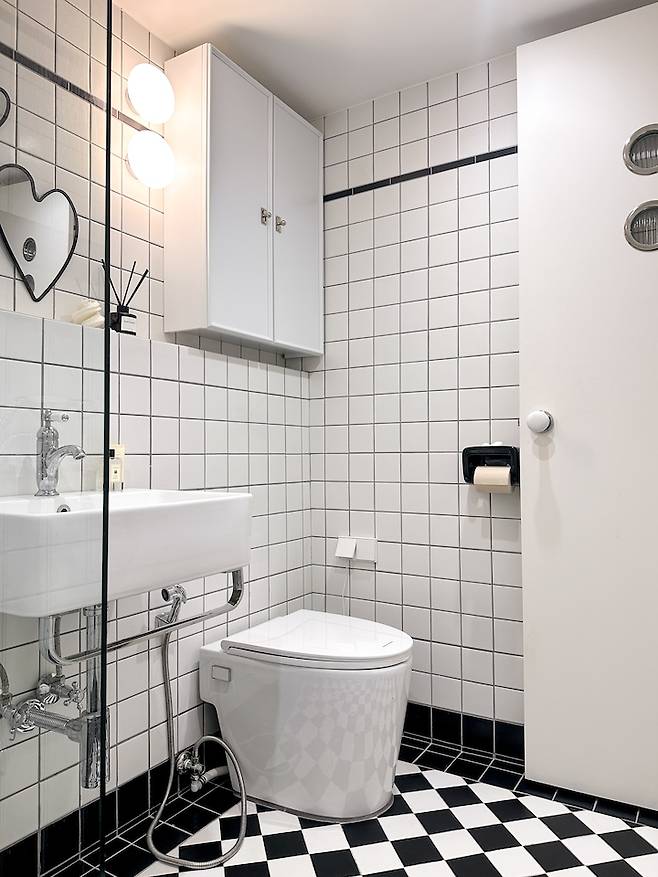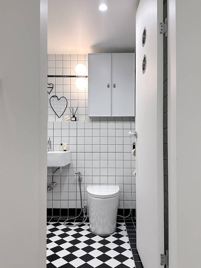 공용 욕실은 무광의 블랙&화이트 타일을 사용해 통통 튀는 공간으로 계획했어요. 양변기와 세면대 공간은 거실과 높이를 같게 하여 건식으로 사용하며, 로봇청소기가 수시로 청소할 수 있어서 늘 깨끗하게 유지할 수 있어요.