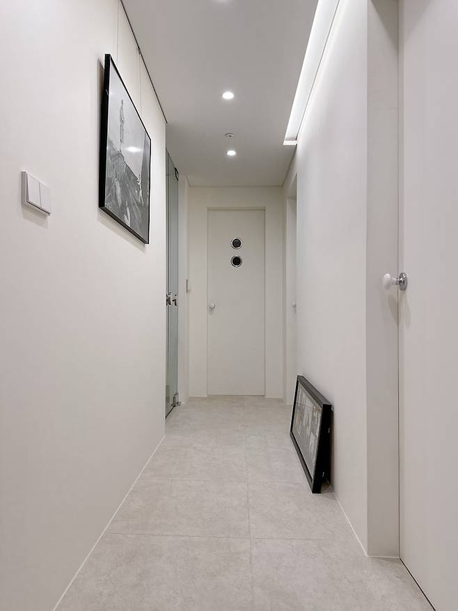 복도의 모습입니다. 무문선/무몰딩/무걸레받이로 선을 최소화하여 깔끔함을 주었지만, 무몰딩일 경우에는 보통 문을 복도 라인에 맞춘 히든 도어로 만드는 대세(?)와 다르게 저는 문이 방 안쪽으로 들어가게 했어요.