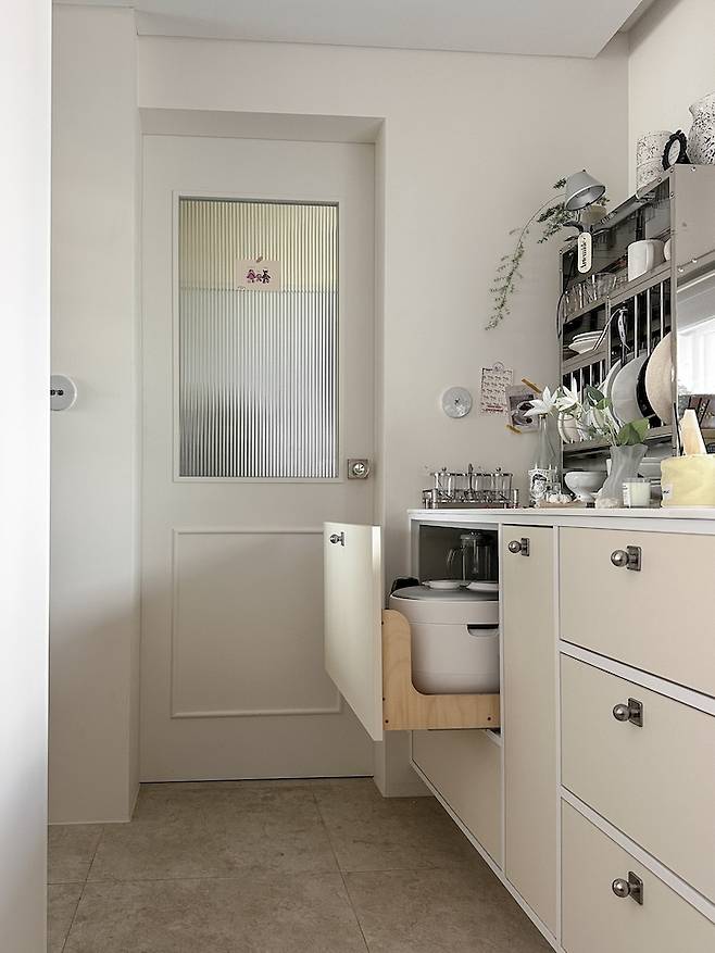 넉넉한 수납을 위해 일반적인 팬트리처럼 키큰장으로 짤까 잠시 고민도 했지만, 지금까지 여러 집을 거치며 생활해 보니 키가 작은 저는 상부장을 거의 사용하지 않더라고요. 그래서 과감하게 상부장이 없는 주방처럼 설계해서 다용도실이라기보다는 보조주방처럼 보이는 공간이에요.