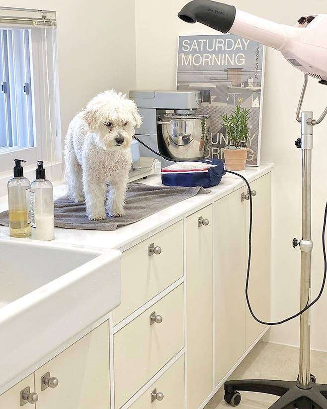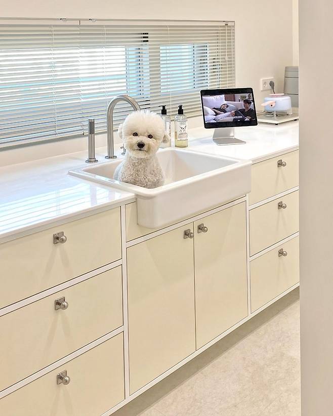 목욕하러 온 뽀숑이예요. 이 싱크대에 독특한 점이 있다면 싱크용 수전이 아닌 4홀 샤워 수전이 설치되어 있어요. 뽀숑이 목욕과 화분 물 주는 것이 주 목적인 공간이기에 과감한 선택을 했어요.