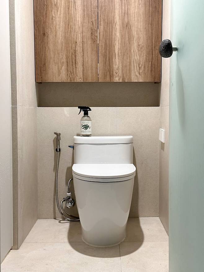 실제로는 내부가 거의 보이지 않기에 불편함은 없답니다. 그리고 양변기 좌측으로는 기존의 욕실 공간인데, 저는 팬트리로 사용하고 있어요. 지금은 정리가 안되어서 보여드릴 수는 없지만, 침구가 많은 저에게는 아주 유용한 이불장 공간이 되어주고 있어요.