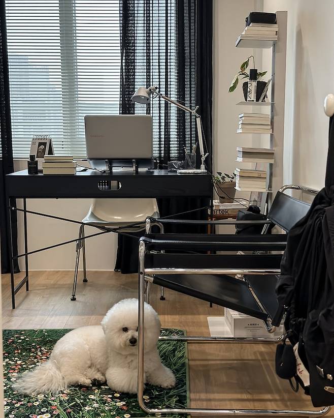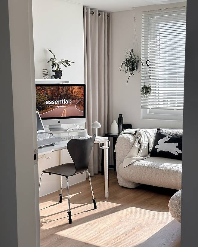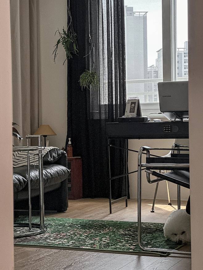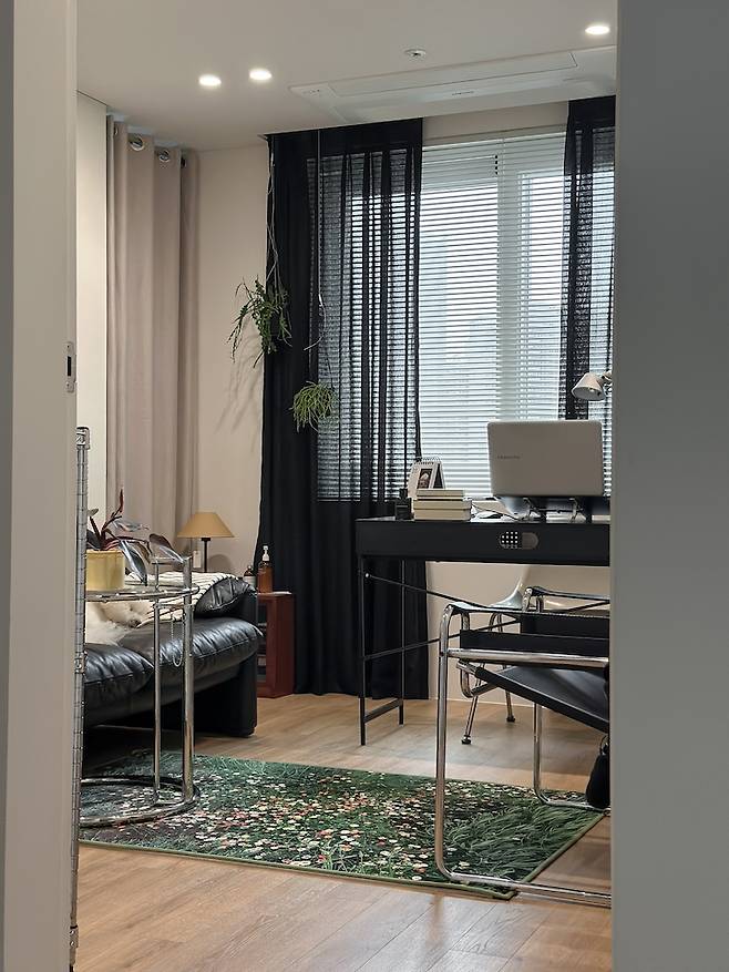 무채색이 가득한 공간이라 너무 칙칙해질까 싶어 꽃 밭 이미지의 러그로 생기를 주고, 블라인드 위로 블랙이지만 린넨 소재의 커튼을 달아 모던함에 살짝 부드러움을 추가해 봅니다.