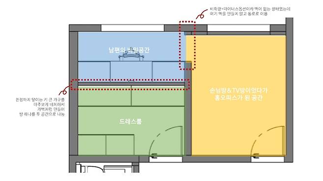 놀러 온 손님들은 직접 보고도 어떻게 방을 나눈 건지 묻기도 하시길래 좀 더 이해가 쉽도록 도면으로 가져왔어요. 4bay 구조상 작은방이 나란히 붙어 있는데, 첫 번째 방을 반 나눠서 앞에는 드레스룸 뒤로는 이 공간을 배치했어요.