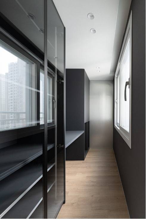 그리고 이 공간의 반대편으로 붙어있는 드레스룸입니다. 외출 후 바로 옷을 갈아입고 외부에서 묻은 먼지들을 집으로 가져오지 않게 하기 위해서 현관에 들어오자마자 바로 보이는 방이라 드레스룸을 배치했어요.