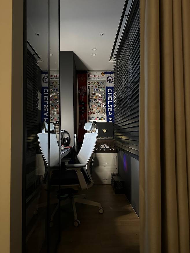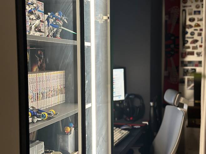 베이지색 커튼을 열면 나타나는 남편만의 비밀 공간이에요. 소개에서 말씀드렸듯 남편은 '취미 부자'예요. 축구도 좋아하고, 야구도 좋아하고, 만화책도 좋아하고, 건담도 좋아하고, RC카도 좋아하고, 피규어도 좋아하고, 유니폼도 모으고, 게임도 좋아하고.