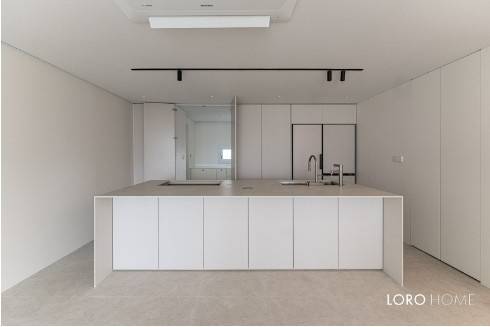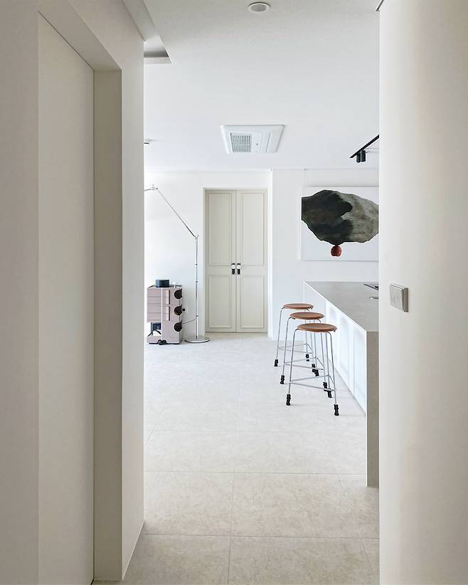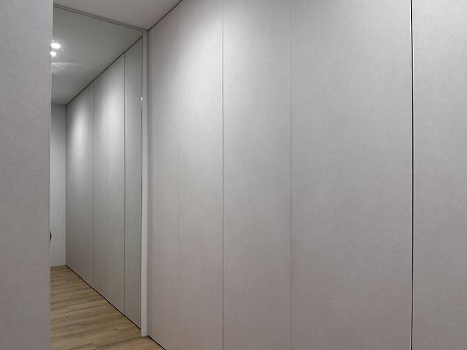 집에 들어오자마자 보이는 공용 공간들은 최대한 단정하고 넓어 보이길 원했어요. 무몰딩, 무걸레받이, 무문선, 평천장 등 공간 속 선들을 최소화시키는 요소들을 모두 적극적으로 활용하였고, 밝은 포세린 타일과 웜 화이트의 도장 벽으로 마감했죠. 실물로 보면 확실히 실제 공간보다는 조금 더 넓게 느껴지는 것 같아요.