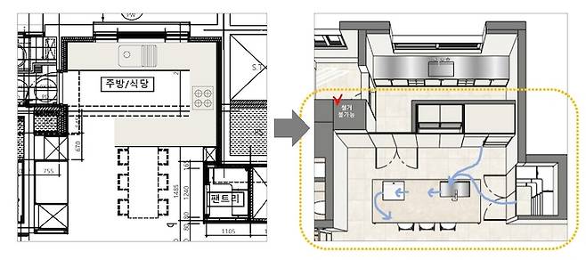 좌측 : 마이너스 옵션이 아닌 집들의 주방, 우측 : 우리 집 주방 (노란 박스가 사진에서 보여지는 부분)