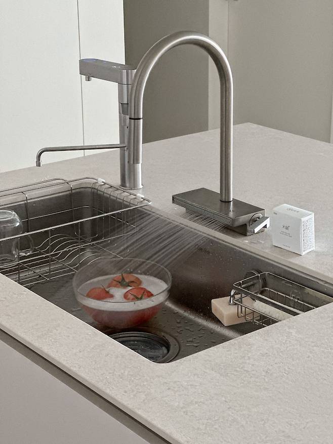 그리고 사각 싱크대 사용하면 모서리 물 때 걱정 많이 하시던데 데 이 모델은 살짝 곡면이라 관리 부분에서도 불편함이 없고요. 한스그로헤 수전은 저 물줄기가 뿜어지는 것에 반해서 큰맘 먹고 구매했는데, 사실 굳이? 하는 기능이라 돌아가면 이 돈으로 다른 거 살래요. 하하하