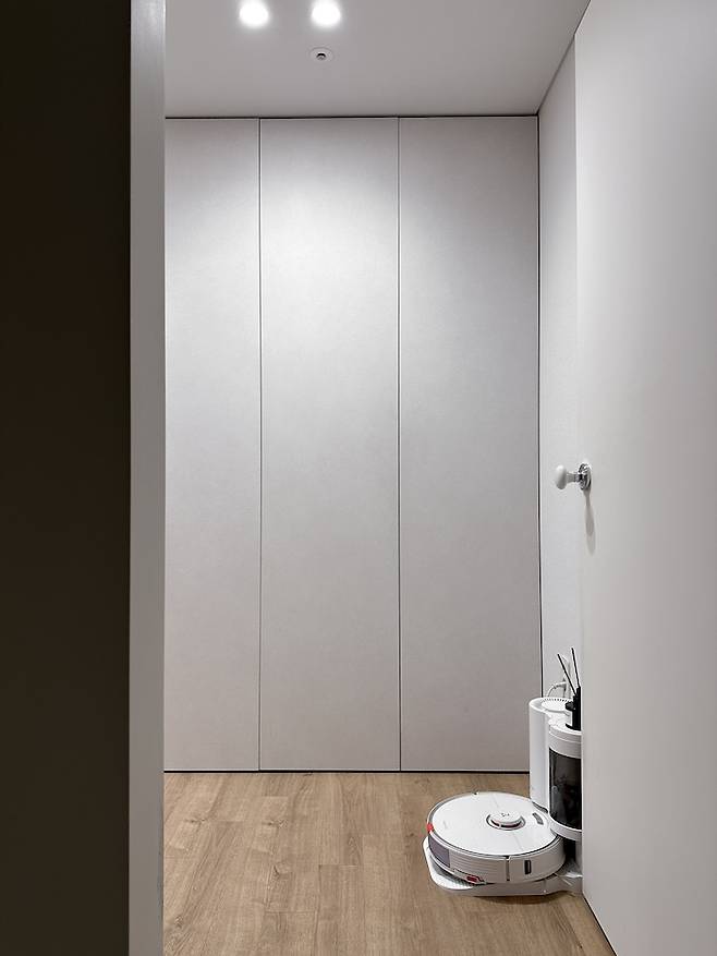 키 큰 붙박이장으로 꽉 채웠고, 로봇청소기도 여기에 있어요. 붙박이장 도어의 소재와 색감이 실물과는 조금 다른데, 따뜻한 톤의 콘크리트 패턴 pet 소재입니다. 무광에 텍스처가 살짝 있는 질감이며 손 때가 남지 않아서 정말 좋은 선택이었다고 생각하며 사용하고 있어요.