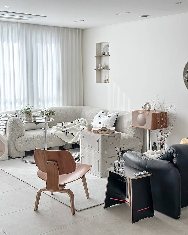 거실이 그렇게 넓은 공간이 아님에도 하다 보면 매번 새로운 레이아웃이 나오고, 그럴 때마다 혼자 굉장히 뿌듯해해요. 그리고 거실이라는 하나의 공간 안에 독서존/눕방존/홈카페존 등 다양한 구역이 생기기도 하고요.
