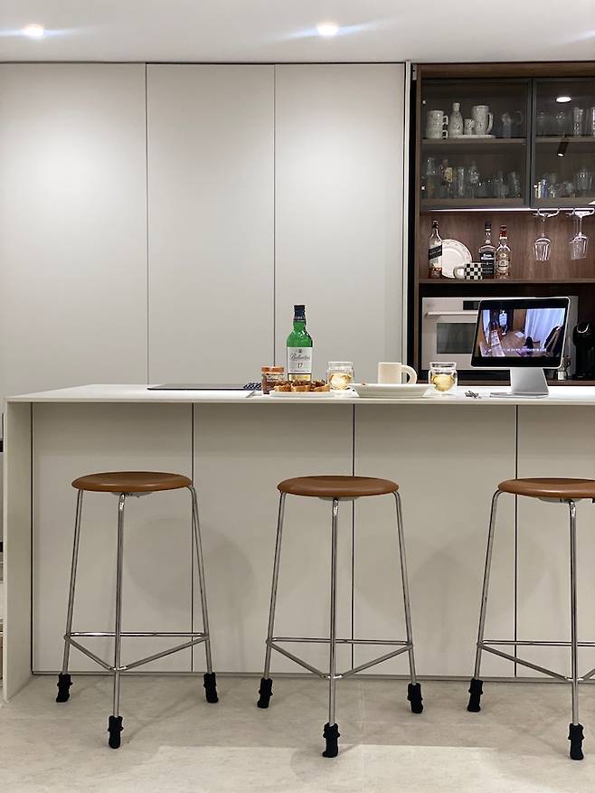 바 테이블을 만드니 이렇게 술 마시기 딱이라는 점도 좋지만, 사실은 퇴근 후 간단하게 휘리릭 차려서 빠르게 먹고 치울 때 동선이 짧다는 게 최고 좋아요.