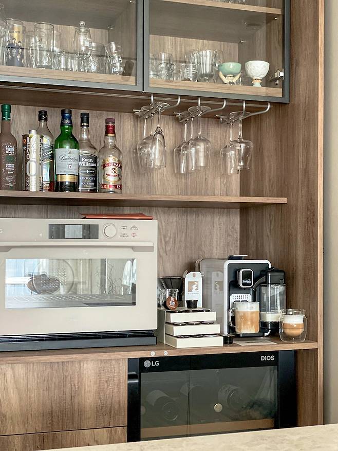 좋아하는 술과 커피, 차, 그리고 컵들을 잔뜩 모아둔, 아주 아끼는 공간이에요. 문을 닫았을 땐 집이 넓어 보이기 위해 소재와 컬러를 최소한으로 썼지만, 문을 열면 이렇게 다른 소재&컬러인 우드 홈바가 등장하도록 했어요.