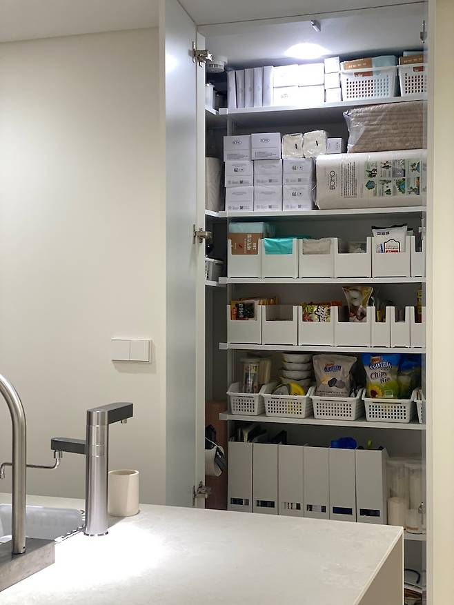 여긴 주방 우측 벽에 숨어있는 팬트리입니다. 청소기도 숨어있고, 생필품도 잔뜩 쟁여져 있고, 여러 식자재도 보관하고 있어요. 팬트리를 수시로 정리하는 정리 요정까지는 아니지만 처음 세팅한 곳에 다시 두면서 이 상태를 쭉 유지하며 지내고 있어요. 정리를 잘 해두면 무언가를 찾을 때 불필요한 에너지 소모가 없다는 게 정말 좋거든요.