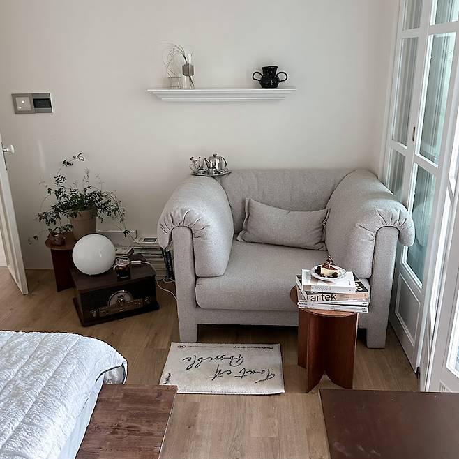 침대 맞은편에는 넓은 1인 소파가 있어요. 사랑스러운 곡선 라인이 마음에 쏙 드는 소파예요.